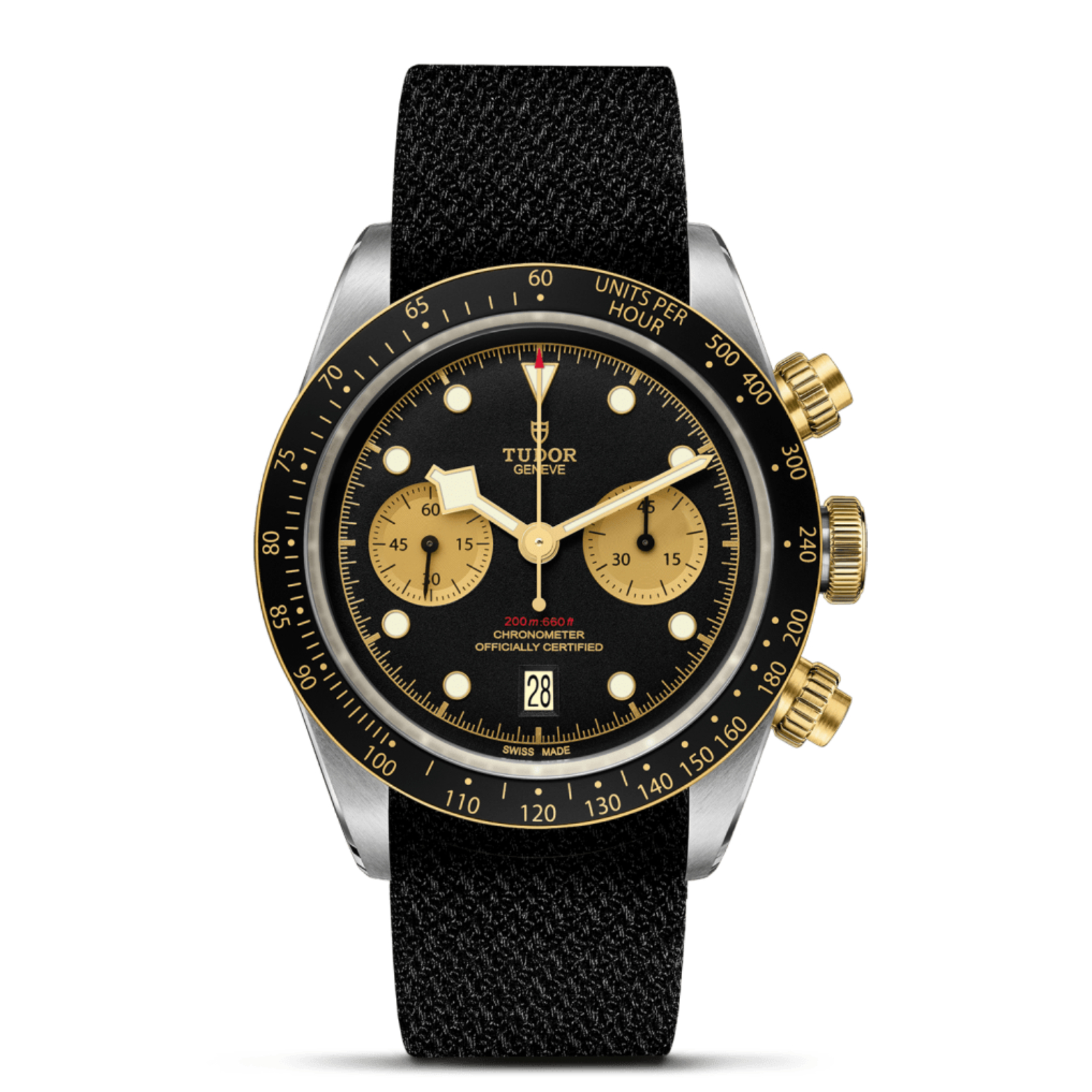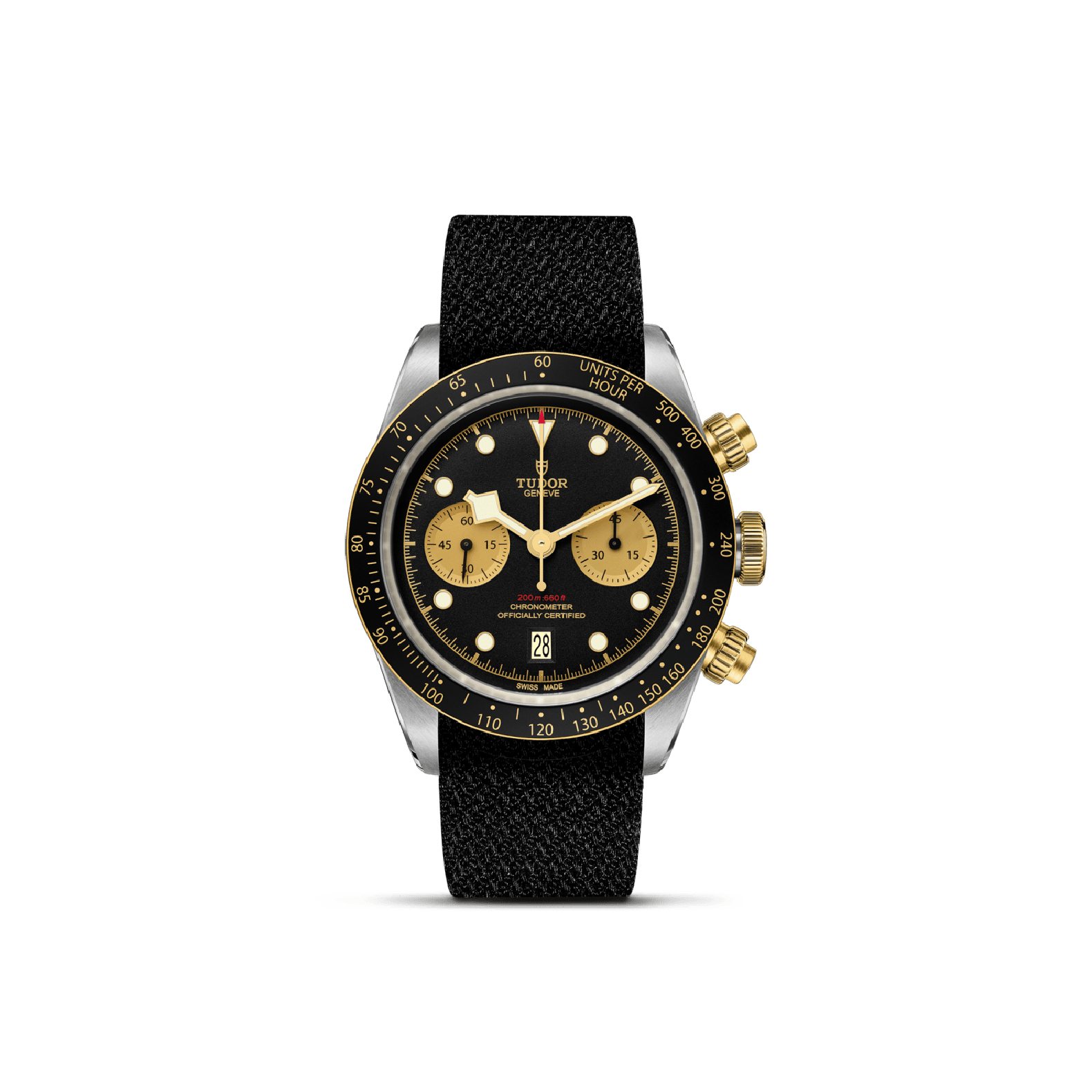 Screw-down winding crown with the TUDOR rose in relief. Solid yellow gold screw-down pushers at 2 and 4 o’clock. Steel covered by a 0.3mm yellow gold cap