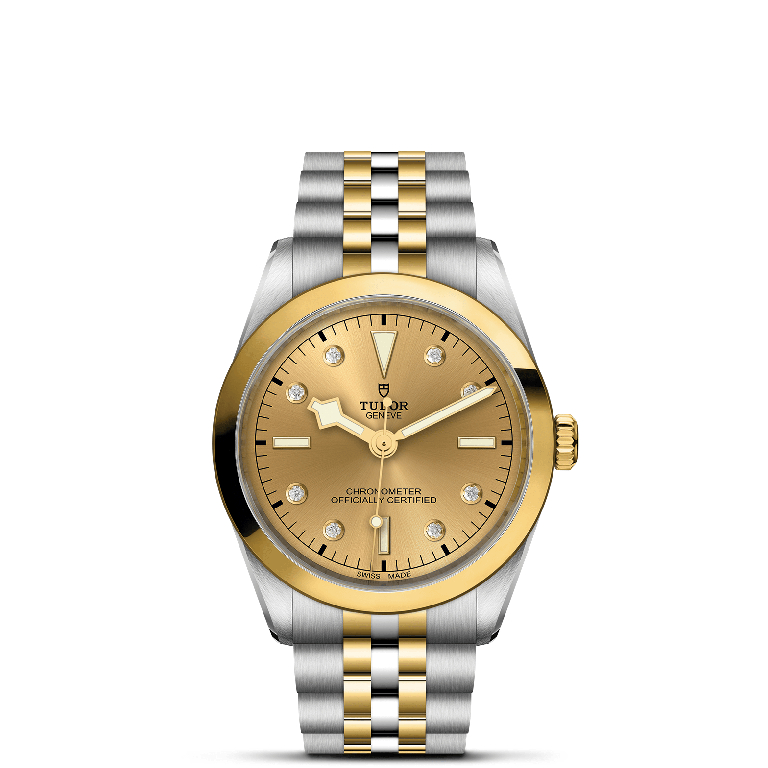 First center links in steel or solid yellow gold. Remaining center links in steel or steel covered by a 0.2mm yellow gold cap. TUDOR “T-fit” folding clasp with safety catch. The logo on the catch is made of solid yellow gold