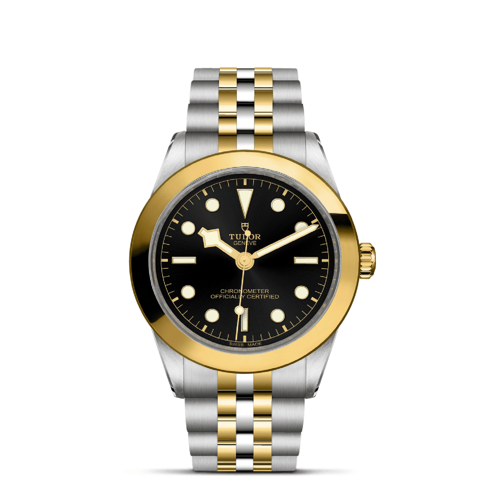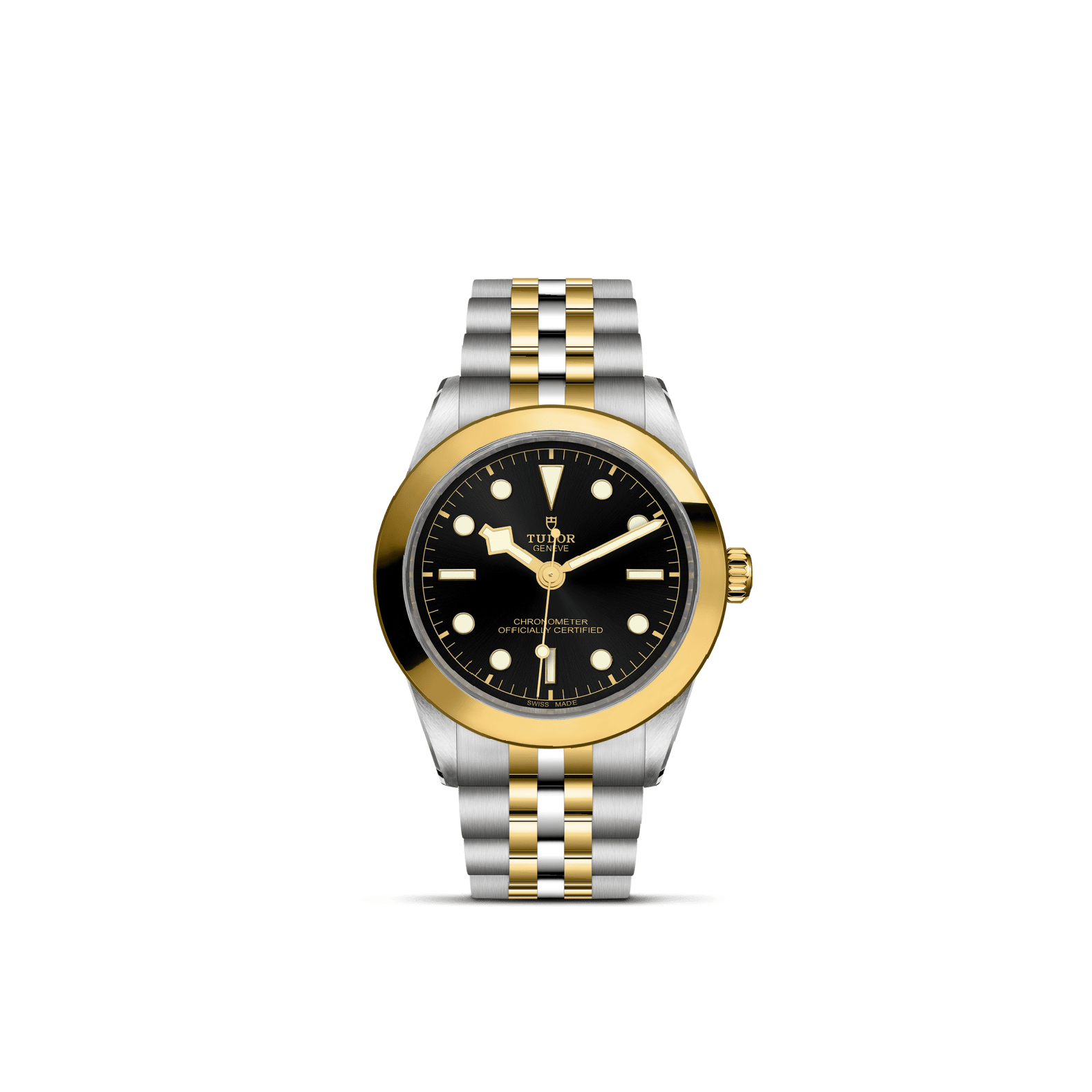 First center links in steel or solid yellow gold. Remaining center links in steel or steel covered by a 0.2mm yellow gold cap. TUDOR “T-fit” folding clasp with safety catch. The logo on the catch is made of solid yellow gold