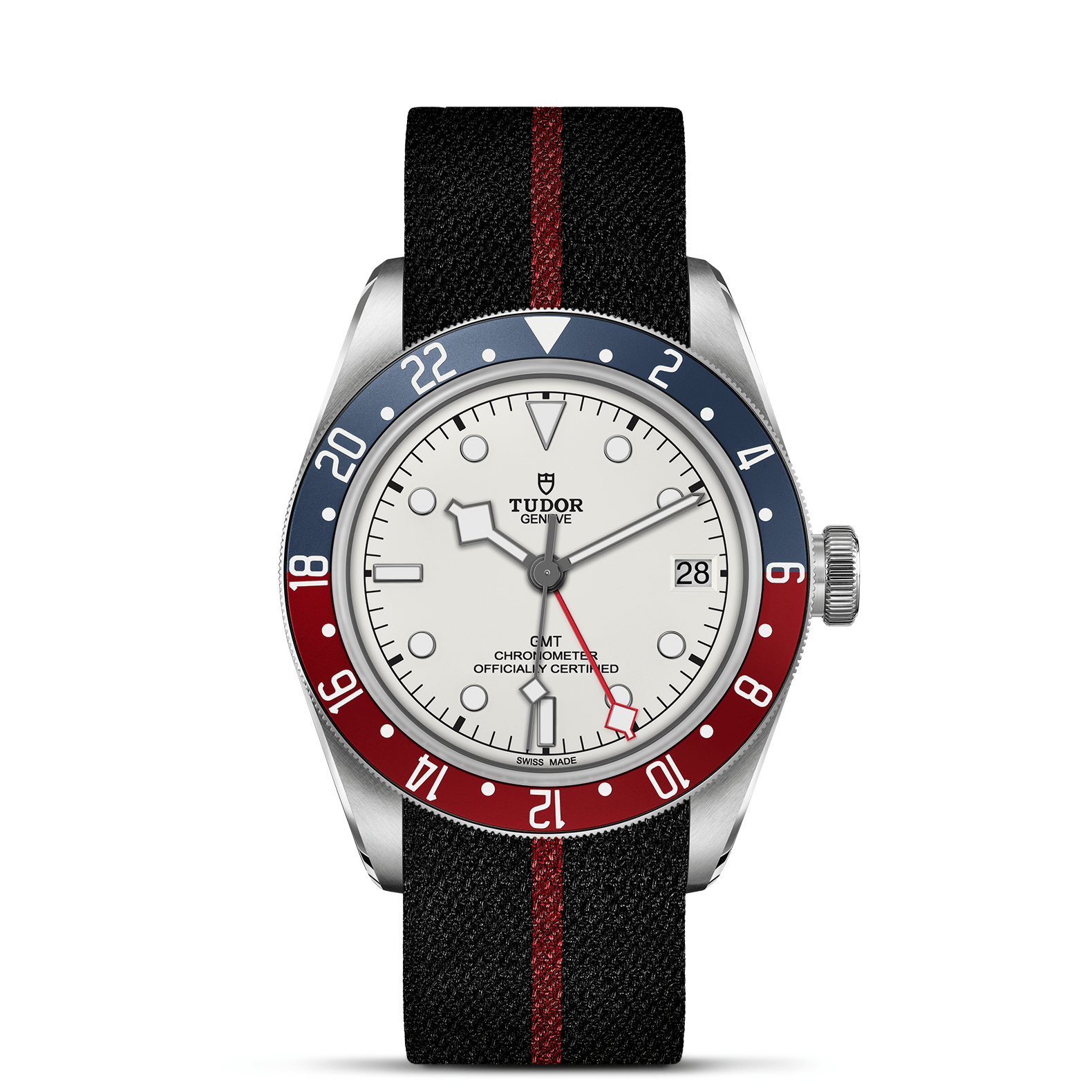 Bidirectional rotatable 48-notch bezel in steel with 24-hour graduated anodised aluminium disc in matt burgundy and blue